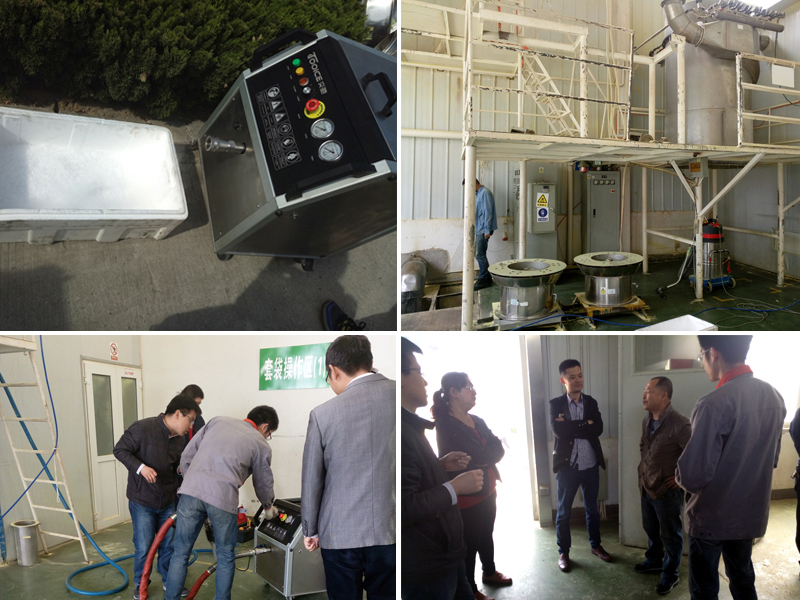 煙臺突馳機(jī)電科技應(yīng)某產(chǎn)業(yè)園工廠要求現(xiàn)場試驗(yàn)——用干冰清洗機(jī)對生產(chǎn)設(shè)備內(nèi)壁進(jìn)行清洗效果演示。